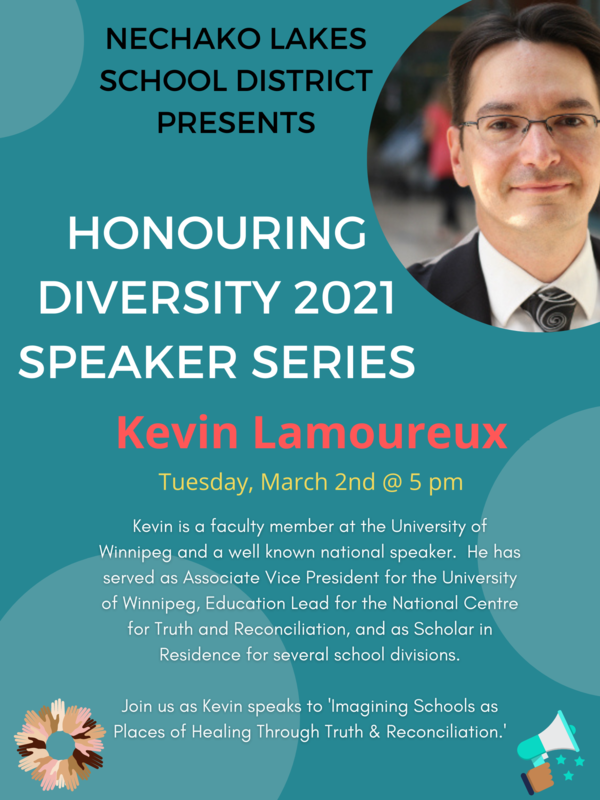 Join us as Kevin Lamoureux speaks to “Imagining Schools as Places of Healing Through Truth and Reconciliation” this session will be virtual via Microsoft Teams and the link will be published to our website and social media on Monday, March 1, 2021.