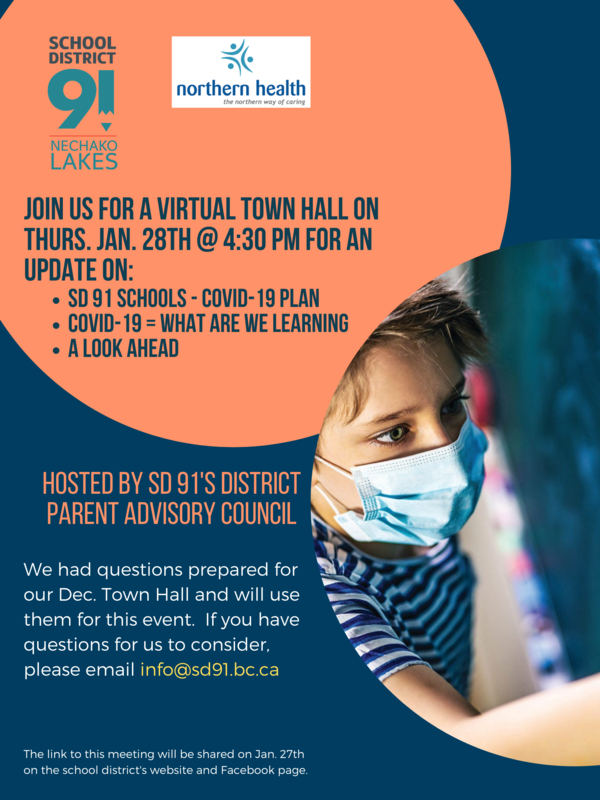 Please join our virtual Town Hall event hosted by our DPAC and featuring guests from Northern Health Thursday January 28, 2021 at 4:30 pm.  You can access this event by clicking HERE.